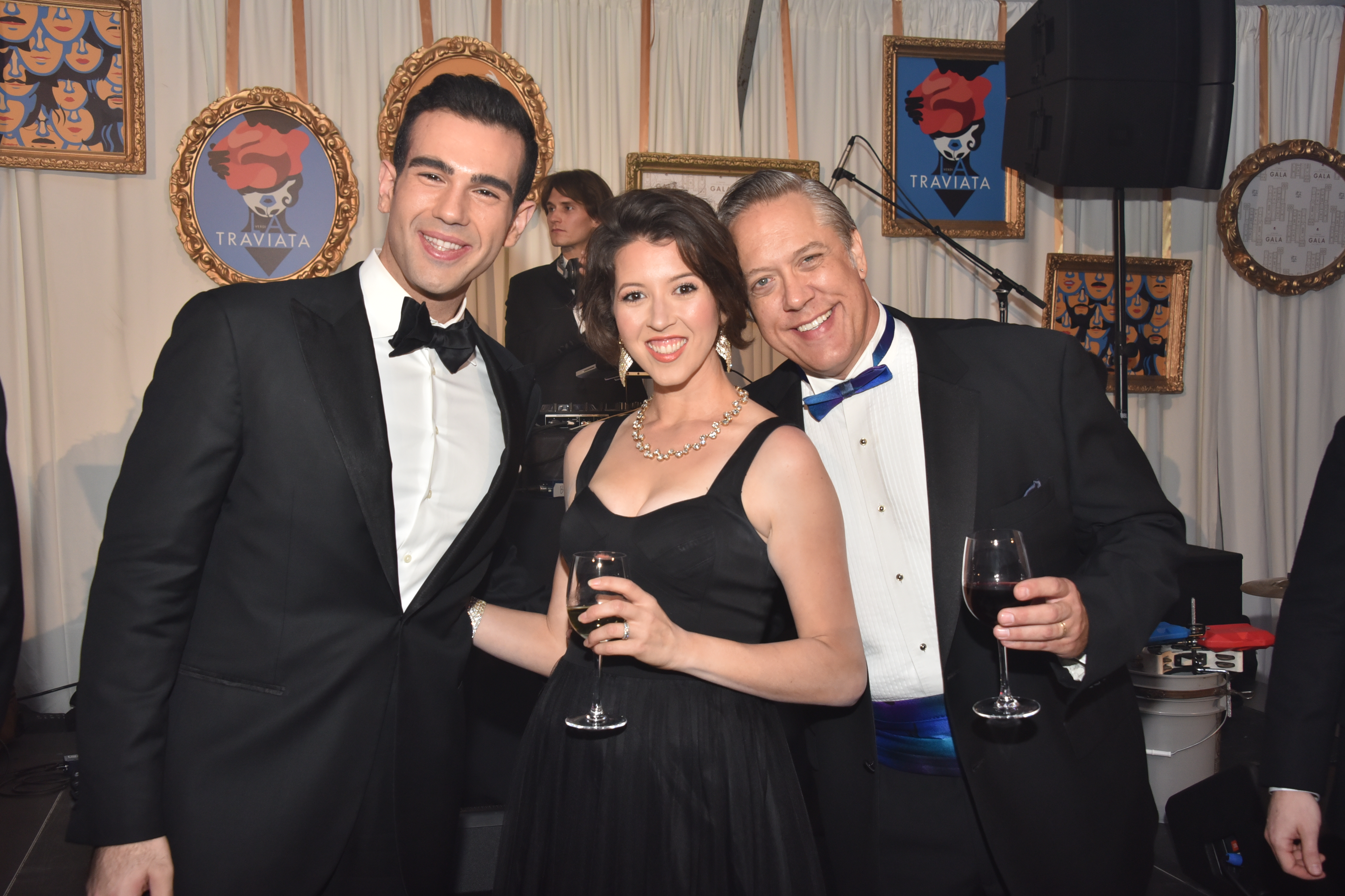 La Traviata cast members tenor Roy Hage (Gastone), soprano Lisette Oropesa (Violetta), and baritone Stephen Powell (Germont)